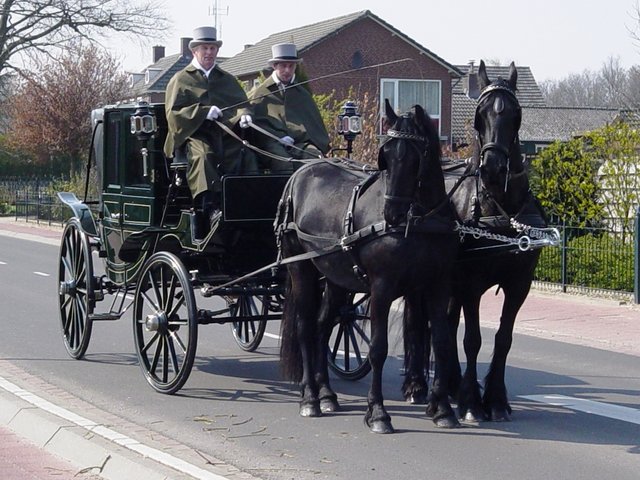 The Friesian quadrille is a well-appreciated show number. It is comprised of 8 sjees, drawn by Friesians, driven by gentlemen accompanied by a lady, both dressed in traditional costumes like those worn in the 1850's. Complex patterns are driven, showing the drivers' trust in the obedience of their horses.