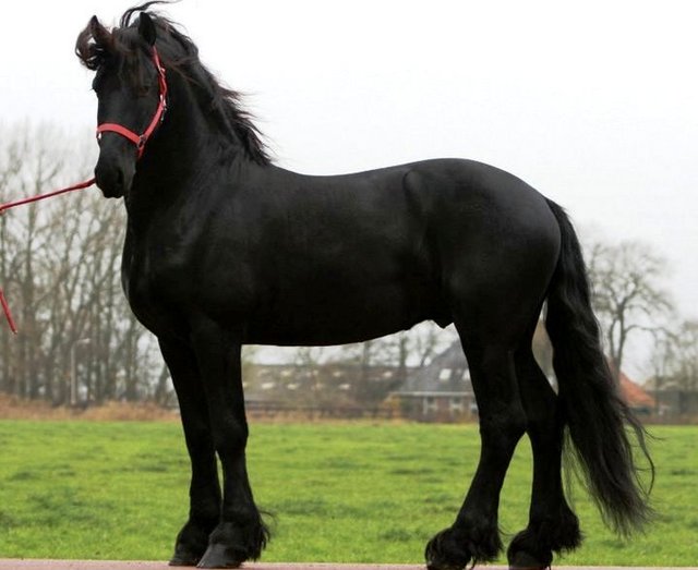 Without a doubt, the black coat of the Friesian will impress you at first sight. Bays and grays occurred earlier in the breed, but now black is the only recognized color. A small white forehead star is also allowed. Other obvious characteristics are the long, heavy mane and tail and the Shire-like fetlock hair.